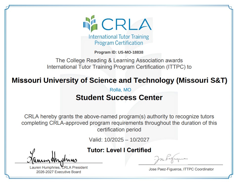 The Student Success Center holds Level 1 Certification from the College Reading & Learning Association (CRLA), meaning our tutors are trained to meet nationally recognized standards. This ensures you receive high-quality, consistent, and supportive academic assistance every time CRLA ITTPC Certificate